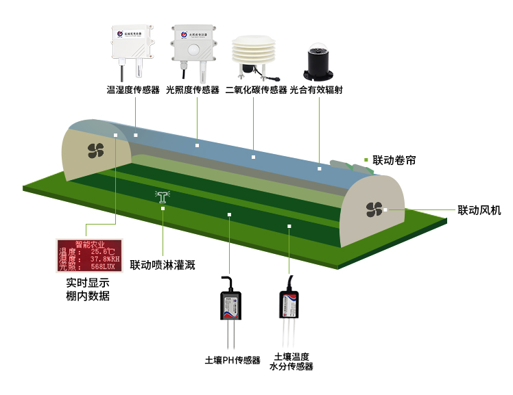 由多要素土壤傳感器和百葉盒傳感器RS-BYH-M組成,其中土壤變送器能夠?qū)ν寥赖臏囟?、含水量、電?dǎo)率、PH值、氮、磷、鉀等因素進(jìn)行實(shí)時(shí)監(jiān)測;其中的百葉盒傳感器內(nèi)置溫濕度、二氧化碳、光照等傳感器,能夠?qū)崟r(shí)監(jiān)測大棚內(nèi)的空氣溫濕度、二氧化碳濃度和光照強(qiáng)度等氣象因素,然后通過GPRS/4G的方式將數(shù)據(jù)上傳至云平臺。
